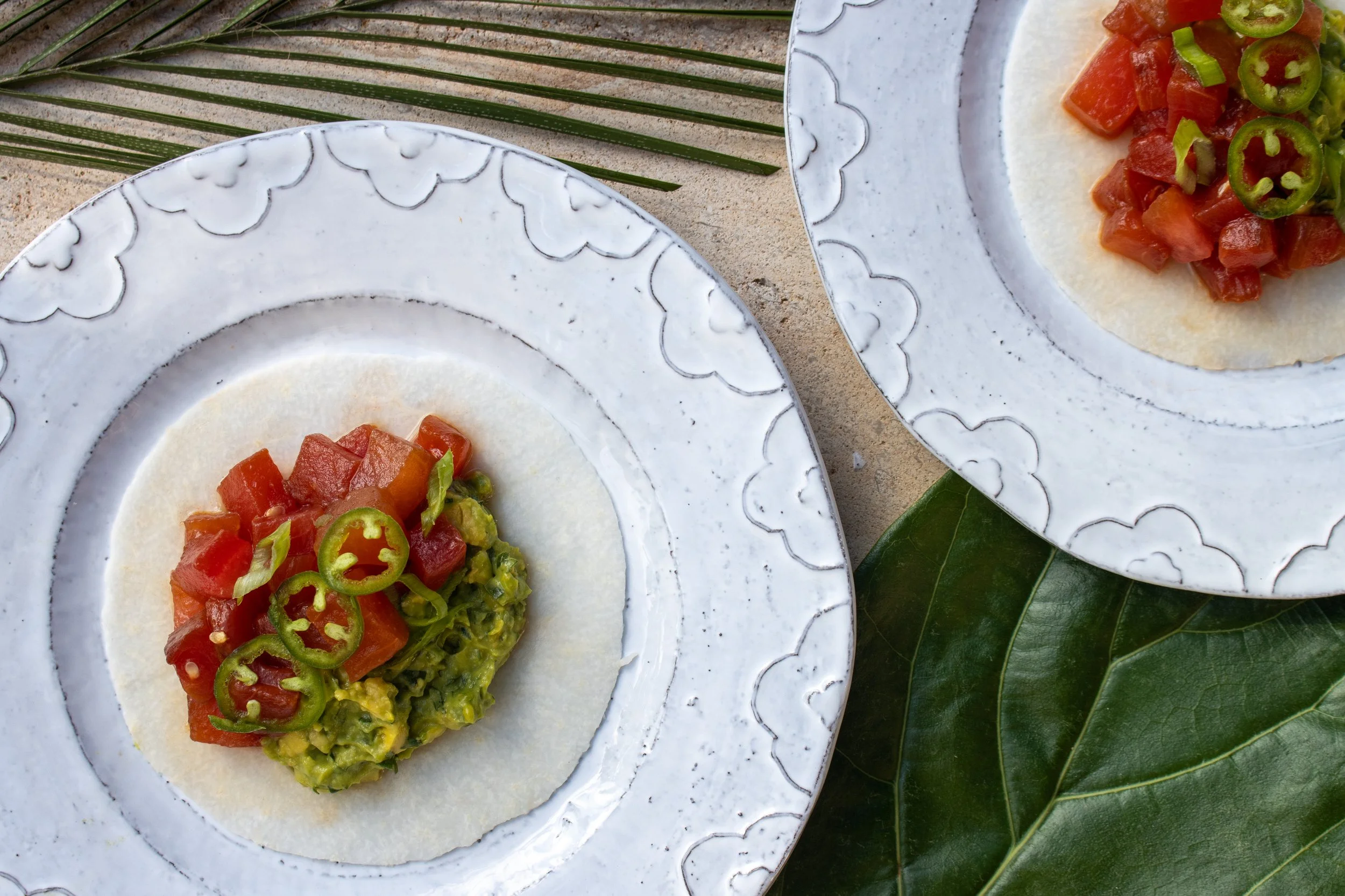 4. To assemble the tacos, start with your jicama slices, add a tablespoon of guacamole, followed by a heaping tablespoon of the chilled watermelon. Top with a jalapeño slice and some green onion. Enjoy!